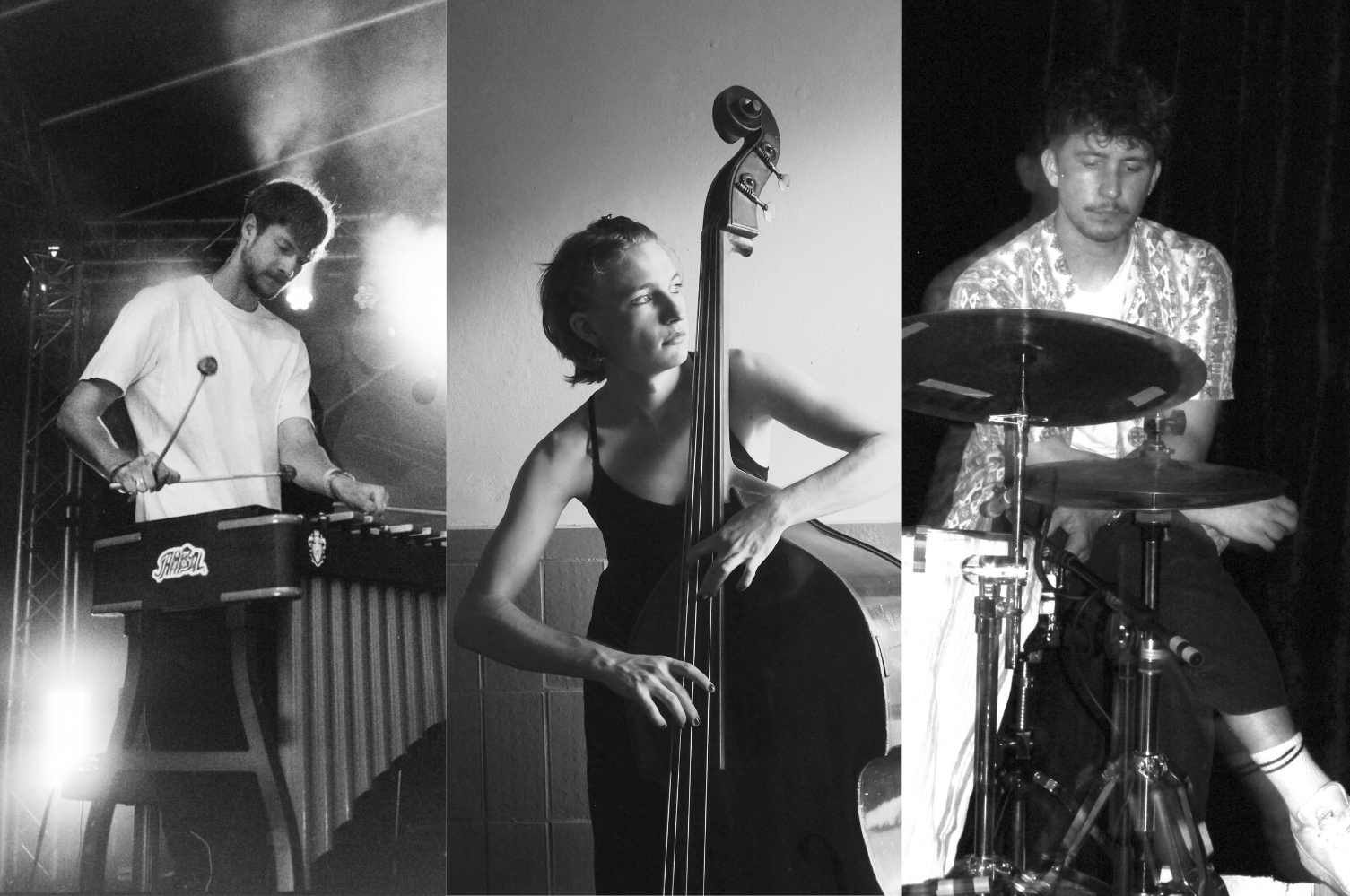 Das Trio zu Dritt: Vibraphon, Bass, Schlagzeug.