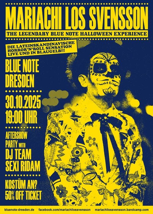 The legendary Blue Note Halloween Party has been around for many years. As the first Halloween party in Dresden, always with live act Mariachi Los Svenson (Mexico/Sweden) and DJ act team Sexi Riddam, the fantastically decorated and authentic Halloween party has its eerily spooky reputation beyond national borders. Adrenaline and sweet liquor meet.