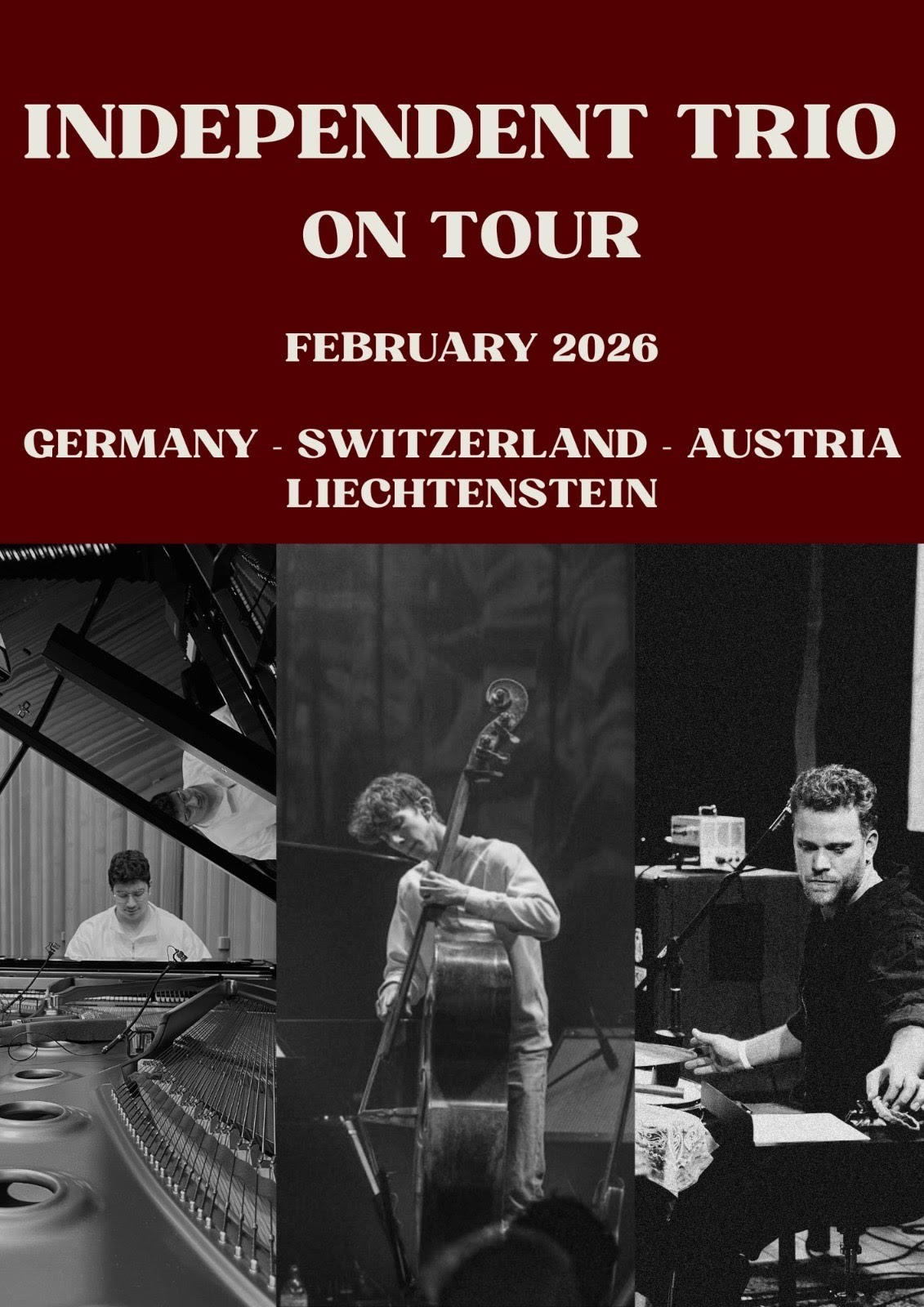 Independent Trio Das Independent Trio vereint drei vielversprechende junge Musiker aus dem deutschsprachigen Raum, die trotz geografischer Distanz eine gemeinsame musikalische Sprache gefunden haben. Mit ihren Kompositionen bringen sie eine eigenständige Ästhetik des Modern Contemporary Jazz auf die Bühne. Neugier, Spontanität und Spielfreude prägen ihr Zusammenspiel. Ihre Musik erzählt Geschichten, überschreitet Grenzen und entfaltet insbesondere live ihre volle Wirkung. Auf der Tournee spielt das Trio in jeder Stadt gemeinsam mit einer lokalen Saxophonist:in. So entsteht bei jedem Konzert eine neue Konstellation, die der Musik eine eigene Note verleiht und viele überraschende Momente hervorbringt. Dominik Gershkovich – Piano (Leipzig, DE) Paul Studer – Bass (Zürich, CH) Luca Görg – Schlagzeug (Luzern, CH)